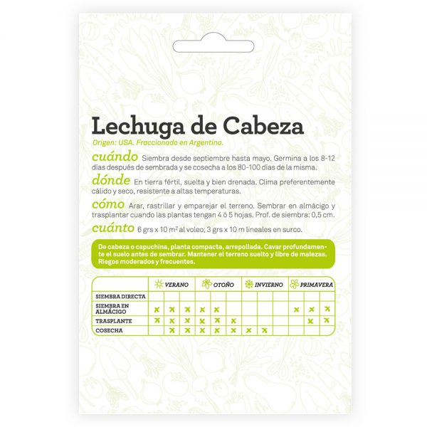 Cuidados y recomendaciones: De cabeza o capuchina, planta  compacta y arrepollada. Cavar profundamente el suelo antes de sembrar. Mantener el terreno suelto y libre de malezas. Riegos moderados y frecuentes.